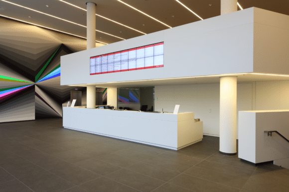 Im Eingangsbereich sind oberhalb der Rezeption 2 ×10 SquareTile-Sonderanfertigungen von eyevis angebracht (Bild: Jörg Küster)