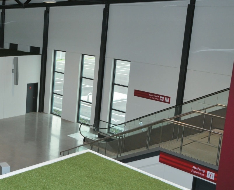 Alle Einrichtungsgegenstände für den normalen Reisebetrieb waren daher weggeräumt. Hier ist die grundsätzliche Problematik sehr gut zu erkennen: Es sind große, hohe Räume mit viel Beton, Glas und relativ wenig Einrichtung. Sollen solche Hallen adäquat beschallt werden, sowohl für eine mögliche Alarmierung wie auch für andere Veranstaltungen, dann sind raumakustische Maßnahmen zwingend erforderlich. Im Rahmen der Planungsarbeiten wurde daher nachdrücklich daraufhin gearbeitet. möglichst viele absorbierende Flächen zu realisieren. Neben den eigentlichen Hallen gibt es noch einige periphere Bereiche und einen über die gesamte Breite des Gebäudes zur Seeseite hin verlaufenden voll verglasten Gang, von dem aus über Gangways der Zugang zum Schiff erfolgt.