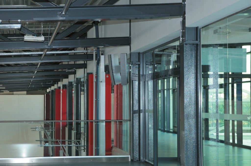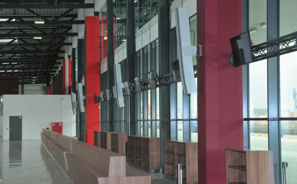 Für Gebäude dieser Größenordnung mit den zu erwartenden Personenzahlen, zudem noch in einem sicherheitsrelevanten Bereich, besteht die Forderung nach einer Sprachalarmanlage nach VDE 0833-4 zur Alarmierung in Gefahrensituationen. Die Herausforderung entsteht in diesem Fall zum einen durch die Größe der Hallen mit entsprechend problematischer Raumakustik und durch den zu er – wartenden Störpegel, der von der Menschenmenge ausgehen kann.