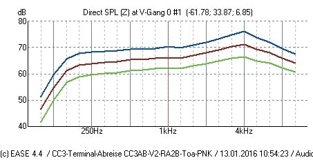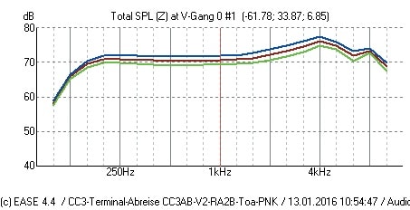 TOA liefert zur SR-S4 eine GLL-Datei, die von 600 W maximaler Leistung entsprechend dem Datenblatt ausgeht. D. h. diese GLL wird als Maximalpegel einen Wert berechnen, bei dem der Lautsprecher mit 600 W belastet wird. Im CC3 sind jedoch alle Lautsprecher über 100 V-Übertrager angeschlossen, die auf 60 W angeschlossen sind. Es gehen somit 10 dB gegenüber dem Maximalwert aus der GLL verloren. Soweit ein einfacher Zusammenhang.