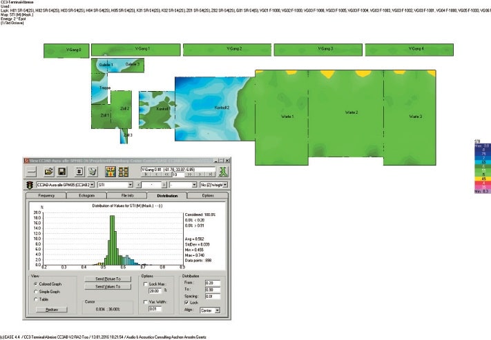 Bei voll ausgesteuerter Anlage lag der Alarmierungspegel mit dem Sprachersatzrauschen bei 86 dBA und somit etwas höher als vorhergesagt, was unter Umständen durch eine leichte Signalkompression schon entstehen kann. Über insgesamt 60 Positionen in allen Bereichen gemessen, ergab sich ein STI-Wert von 0,553 im Mittel und eine Standardabweichung von 0,043 und somit ein Endwert von 0,51. Dieser Wert ist minimal schlechter als vorhergesagt, was nahe liegt, da die Halle völlig leer war. In der Simulation wurden dagegen zumindest einige Sitzgelegenheiten und andere Einrichtungsgegenstände als Absorber einbezogen.