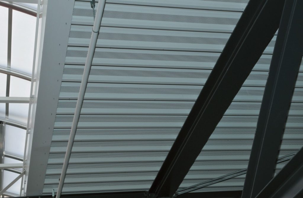 Das Dach war bereits als Blechdach mit Trapezblechen geplant. Der Gedanke lag somit nahe, flächendeckend gelochtes Trapezblech mit hinterlegtem Vlies als Strömungswiderstand einzusetzen, womit ein breitbandig gut absorbierendes Verhalten erreicht werden kann. Für den allgemeinen akustischen Eindruck in der Halle ist mit der fast vollflächig absorbierenden Decke schon der entscheidende Schritt getan.
