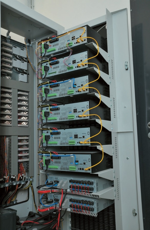 Der hier gewählte Weg mit einer Sondergenehmigung nur für eine Teilmenge der Lautsprecher bei ansonsten vollständiger Erfüllung der Vorgaben aus der VDE 0833-4 ist somit plausibler und auch praktisch gut vertretbar. Die SR-S4 Lautsprecher befinden sich zudem aktuell im Zertifizierungsprozess für die EN54-24. Einfacher gestaltete sich die normgerechte Ausstattung der Zentrale, wo man bei TOA auf komplette Systeme mit EN54-16 und EN54- 4 Zertifizierung zurückgreifen kann. Drei große 19″-Schränke in der Zentrale beinhalten eine DSP-Audiomatrix, Eingangseinheiten und System Manager der SX-2000 Serie, eine Reihe von Class-D-Mehrkanalendstufen sowie die Notstromversorgung.