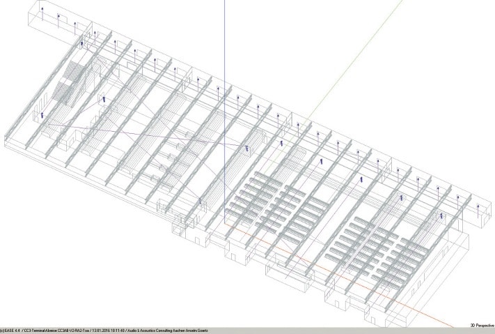 ABB. 1: EASE Modell der Abreisehalle in der einfachen Drahtgitter- Darstellung des EASE Editors (Bild: Anselm Goertz)