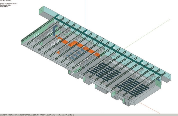 Für die Beschallung kann diese Lösung aber ihre Vorteile nicht ausspielen, weil der Schall aus den Lautsprechern hier gar nicht oder erst nach vielen Umwegen ankommt. Um auch auf Höhe der Lautsprecher und Zuhörer noch weitere Absorberflächen einbringen zu können, wurden Teile der nicht verglasten Wandflächen als fein gelochte Gipskartonplatten definiert. Die Abb. 2 und 3 zeigen dazu die Abreisehalle in der EASE Eyes Darstellung, wo die gelochten Wandflächen orange eingefärbt sind.