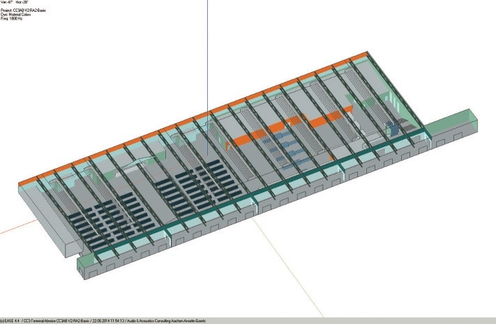 ABB. 2: Modell der Abreisehalle mit Absorberflächen an den Wänden der Einbauten (orange) (Bild: Anselm Goertz)