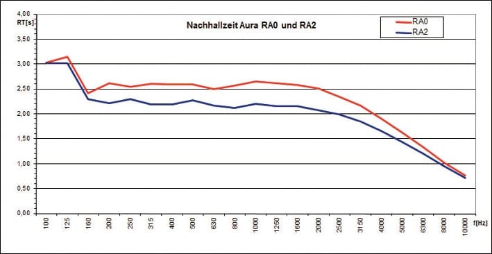 Entscheidend ist jedoch die gute Schallfeldexposition der Wandflächen bei der Lautsprecherwiedergabe. Ausgeführt wurden die Nachhallzeitberechnungen mit der EASE Aura-Methode als simulierte Nachhallzeitmessung mit Kugelschallquellen und den damit berechneten Raumimpulsantworten. Diese Methode ist bei ungleichmäßig verteilten Absorberflächen und verwinkelten Raumstrukturen wesentlich genauer als eine rein statistische Berechnung nach Eyring oder Sabine. Unabhängig davon zeigen die Nachhallzeitberechnungen mit Werten über 2 s, dass eine flächendeckende dezentrale Beschallung, z. B. mit großen Deckenlautsprechern nicht zum Ziel führen würde. Als absoluter Grenzwert kann hier ein Wert von 1,5 s für die Nachhallzeit gesehen werden, besser noch sogar nur 1 s.