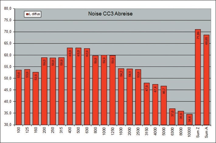 Der mögliche Störpegel wurde dann so festgelegt, dass man von 500 in gehobener Lautstärke sprechenden Personen ausgeht, die pro Person einen mittleren Schallleistungspegel von 70 dBA abgeben. Das entspricht unter Berücksichtigung der Richtwirkung eines Sprechers einem Schalldruckpegel von ca. 65 dBA in Sprechrichtung in 1 m Abstand. Aus diesen Werten, zusammen mit dem Sprachspektrum und der frequenzabhängigen Nachhallzeit, kann der Störpegel und dessen spektrale Zusammensetzung (Abb. 5) berechnet werden. Es ergibt sich ein Wert von 68,6 dBA.