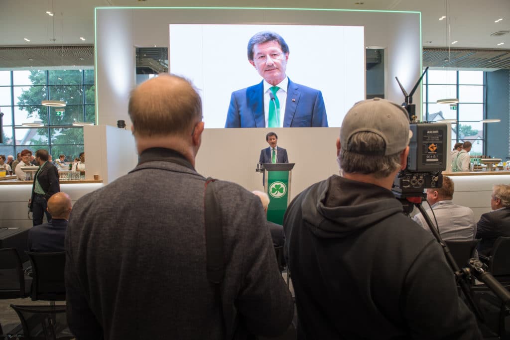 Im ersten Stock des Neubaus befindet die VIP Lounge. Das große Plenum mit 530 qm und die beiden angeschlossenen Loungebereiche mit je 70 m² bieten je nach Bestuhlung Platz für bis zu 450 Personen. Für Präsentationen im Großbildformat wurde die Bühne mit einer 8,4 m² großen LED-Wand ausgestattet. Zwei 85 Zoll Displays von Sony sind links und rechts im Raum angebracht, damit jeder Teilnehmer der Präsentation folgen kann. Als Rednerpult fungiert das Modell Audience von Kindermann – es wurde individuell in den Vereinsfarben der SpVgg Greuther Fürth gestaltet. Ausgestattet ist es mit Kindermann QuickSelect 3.0, das unkomprimierte Video-, Audio- und Steuersignale mittels HDBaseT-Technologie über ein herkömmliches Cat-Kabel übertragen kann. QuickSelect ist über die Cat-Leitung mit dem Technikraum verbunden, wo die Verteilung der Signale über eine Matrix an die LED-Wand und die Displays via HDBaseT erfolgt.