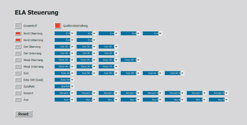 „Wenn einer der Kontakte ausgelöst wird, schaltet eine Logikgruppe die Eingänge stumm“, erklärte Thorsten Krämer. „Eine weitere Logikgruppe wechselt ein Preset, um den ELA-Eingang auf die entsprechende Rufgruppe zu schalten. Das ELA-Signal liegt deshalb hinter allen Mute-Gruppen und Ähnlichem. Auf der Bedienseite für die ELA-Steuerung können die Gruppen auch manuell geschaltet werden.“ Für Konzerte gibt es ein Rack, das Yamaha Ein- und Ausgangseinheiten mit Dante-Schnittstellen Ri8-D und Ro8-D sowie einen Switch beinhaltet. Das Soundweb London sorgt dafür, dass im Normalfall bis zu sechs Signale, z. B. von einem Mischpult bei Konzerten, über das Rack an eine Tour-PA weitergegeben werden. Für Notfalldurchsagen kann dies aber unterbrochen und das ELA-Signal eingespeist werden.