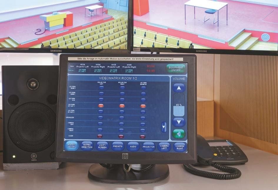 Im Audimax und im Hörsaal H 0104 sind PTZ-Kameras (Panasonic AW-HE130/HE40) primär zur Übertragung in andere Hörsäle installiert, wobei zusätzlich auch die audiovisuelle Aufzeichnung von Lehrveranstaltungen möglich ist. In der Praxis wird von dieser Option eher selten Gebrauch gemacht, da Persönlichkeitsrechte der im Saal anwesenden Personen tangiert werden und erfahrungsgemäß auch eine Nachbearbeitung des Materials erforderlich ist. Reine Mitschriften werden als PDF-Dateien gespeichert und den Studierenden zugänglich gemacht. Bestandteil jedes Dozentenmöbels ist neben den in einem Unterschrank montierten TesiraLUX-Einheiten sowie diversen Anschlüssen (HDMI, LAN, USB, Strom) ein AMX-Touchpanel: Diverse Funktionen lassen sich hier mit einer übersichtlichen, Hörsaal-übergreifend verwendeten Bedieneroberfläche steuern. Mediensteuerung im Hintergrund ist ein AMX NI-4100 NetLinx Integrated Controller.