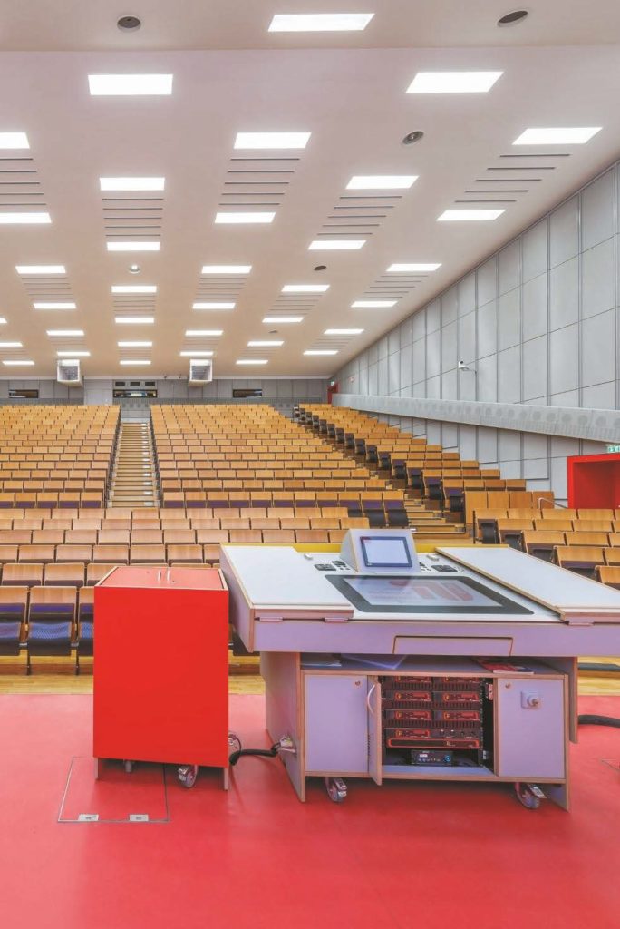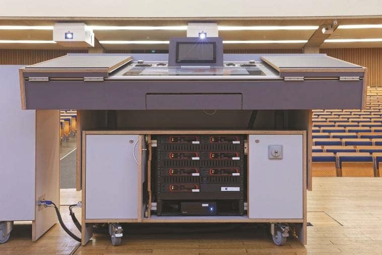 Im Audimax der TU Berlin: Unten im Dozentenmöbel sind TesiraLUX-Komponenten zu sehen (Bild: Jörg Küster)