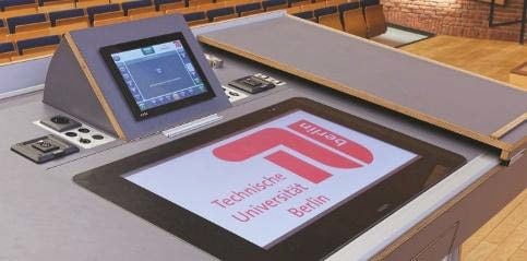 „In puncto E-Learning möchte die TU Berlin führend sein“, sagt Christoph Moldrzyk. „Es ist ausdrücklicher Wunsch des Präsidiums, dass moderne Lehrkonzepte technische Unterstützung finden – wichtig dabei ist eine vorausschauende Planung, da bei unseren Projekten relativ lange Vorlaufzeiten zu berücksichtigen sind.“ In den TU-Hörsälen findet ein E-Kreide-System Verwendung: Der Vortragende hat die Möglichkeit, auf einem in die Tischoberfläche des Dozentenmöbels eingearbeiteten Wacom-Grafiktablet sein „Tafelbild“ zu entwickeln, das fortlaufend auf den beiden Projektoren abgebildet wird. Auf einem der beiden Beamer bleibt das Bild eine Zeitlang stehen, während auf dem zweiten Projektorbild die aktuelle Herleitung visualisiert wird. Gerne genutzt wird in der TU auch die Möglichkeit, auf einer Seite der Projektion eine PowerPoint-Folie abzubilden, während auf der anderen Seite handschriftliche Anmerkungen erfolgen.