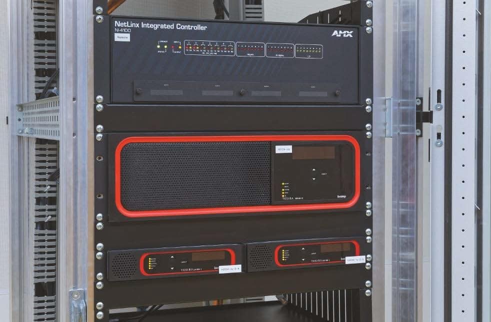 TesiraLUX-Hardware und AMX NI-4100 NetLinx Integrated Controller im Regieraum von Hörsaal H 0104 (Bild: Jörg Küster)