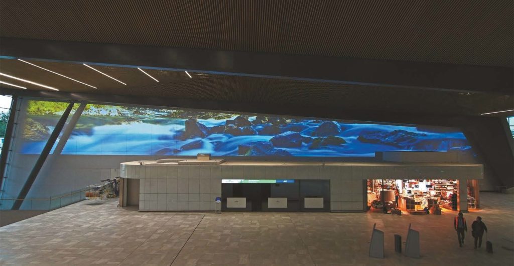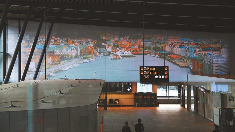 Das neue Terminal am Flughafen Bergen punktet nicht nur durch seine moderne Architektur, sondern auch durch raumgreifende Videowalls, die den Fluggästen Bergens Schokoladenseite präsentieren.