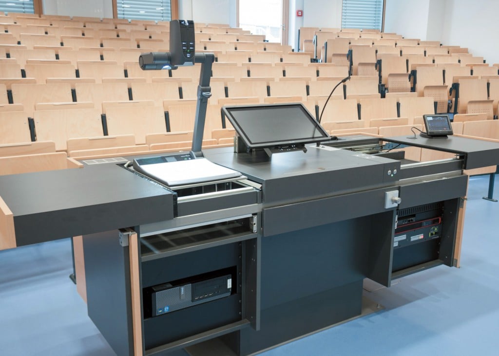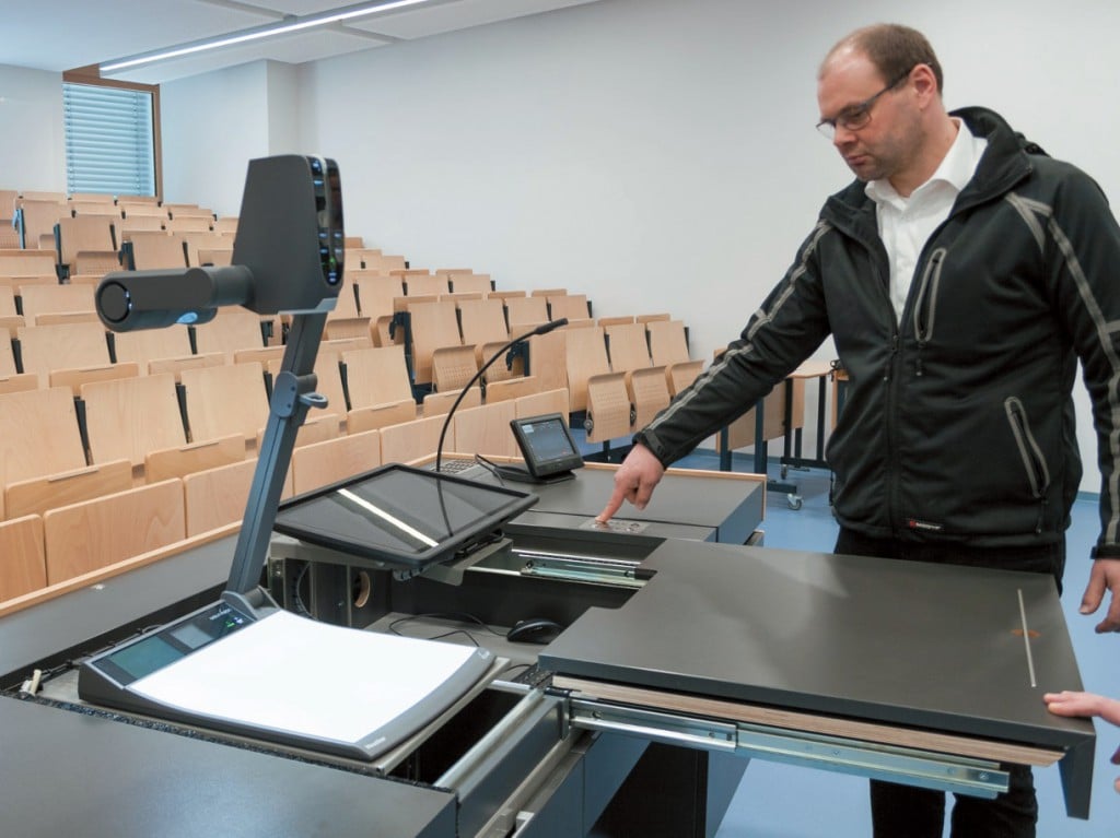 Auch Marcus Faak haben die Medientische in der Praxis begeistert: „Die Installation der Medientechnik lief wirklich reibungslos und auch die Dozenten schwärmen von diesem Tisch: Er bietet ihnen viel Platz und Ablageflächen, ist höhenverstellbar und zudem haben sie natürlich immer die erforderliche Technik griffbereit und müssen sich nicht mehr selbst um technische Kleinigkeiten kümmern.“