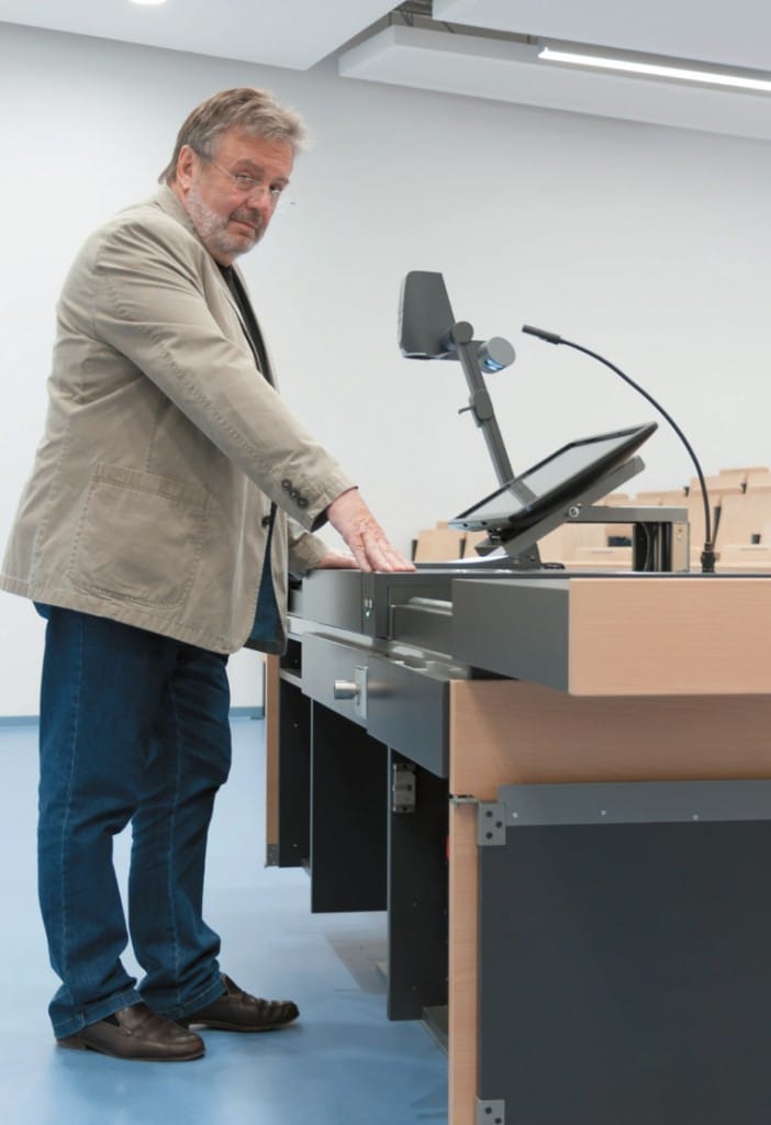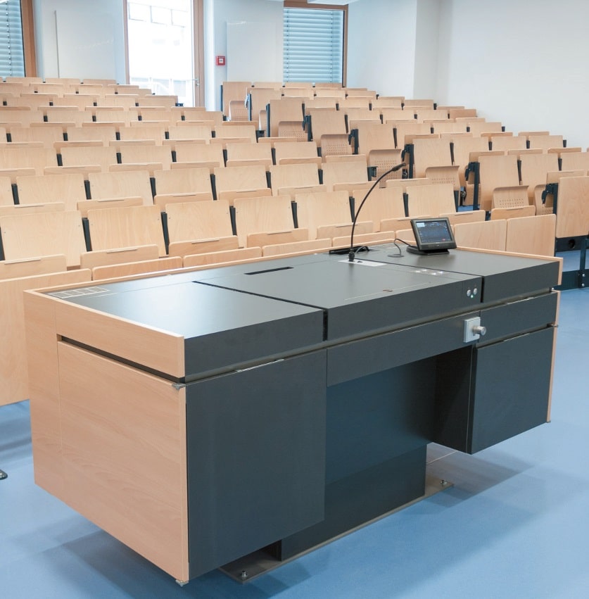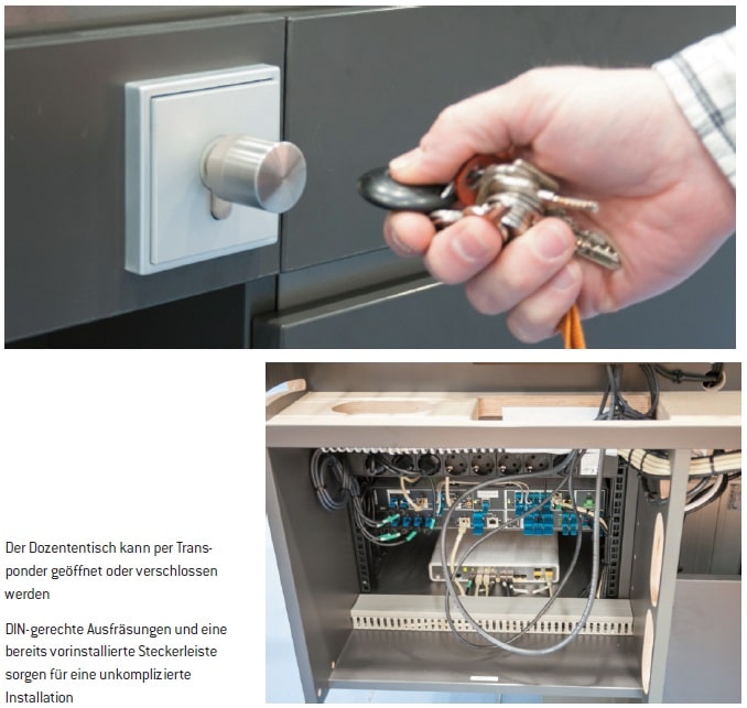 Der Dozententisch kann per Transponder geöffnet oder verschlossen werden (Bild: Claudia Rothkamp)