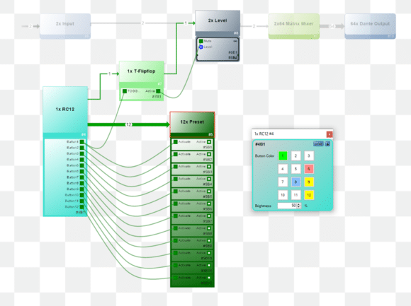Um weitere Beispiele zu nennen: RC12 kann für die Quellenwahl verwendet werden und über ihre Tastenfarben den gerade aktiven Kanal anzeigen. Es ist auch möglich, komplette Farbschemata für alle Drucktasten für verschiedene Szenarien zu definieren.
