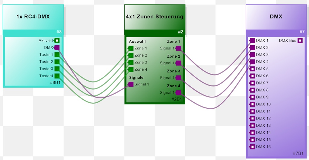 Aber der Block Zonensteuerung ist auch jenseits klassischer „Zonen“ anwendbar. Egal ob Bar oder DMX-Empfänger, Steuersignale werden dynamisch und kontextabhängig geroutet.