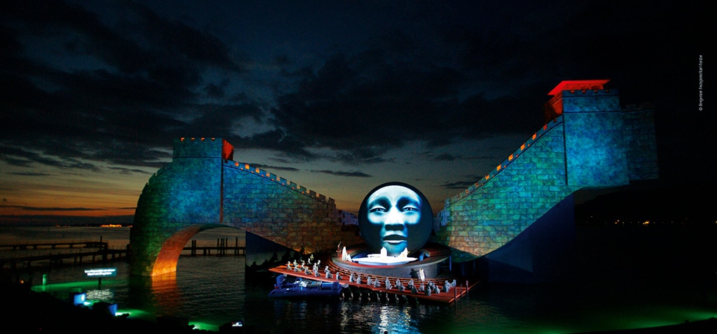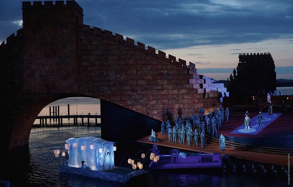 Die von Marco Arturo Marelli entworfene Kulisse für die Turandot-Inszenierung besteht aus einer 72 Meter langen Mauer, die sich wie ein riesiger Drache über die Bühne schlängelt. Aus rund 29.000 Einzelteilen bestehend, sorgt eine aufwendige Konstruktion aus Stahl, Beton und Holz für die Stabilität der Mauer. „Die Bühne hat ein Gewicht von 335 Tonnen; das stellt hohe Anforderungen an die Statik“, wie Stefan Frischke, Steuerungstechniker der Seebühne Bregenz, feststellt. „Schließlich muss das Bühnenbild auch extremen Wetterlagen wie Sturm und Schlagwetter standhalten.“ Wenn es die Regie vorgibt, muss die Mauer jedoch auch effektvoll einstürzen können, wie es gleich zu Beginn der Oper passiert: Dahinter werden über 200 aus Ton geformte Krieger sichtbar, die gleichsam vom Himmel herab in den See zu marschieren scheinen.