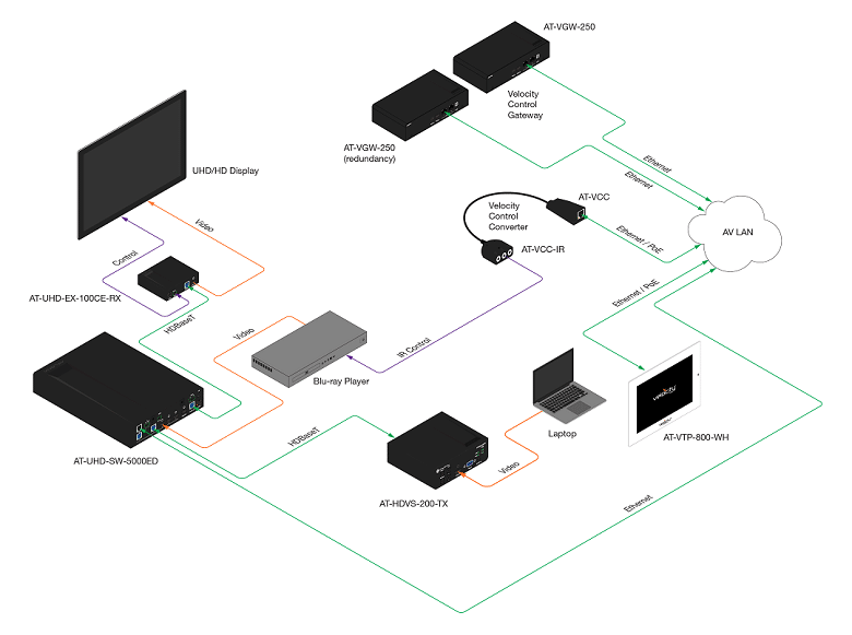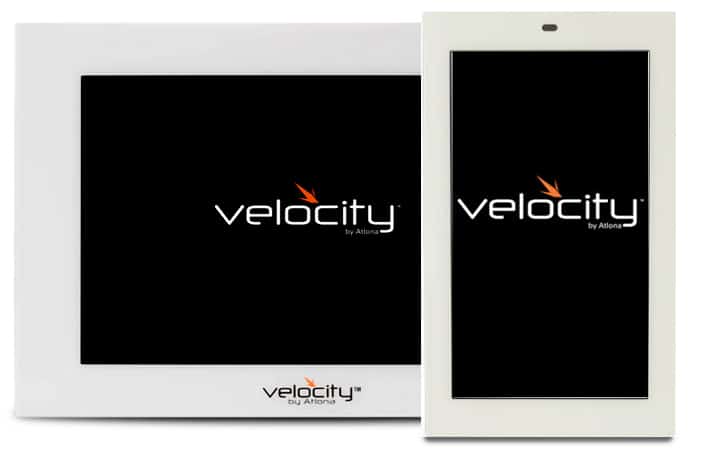 Das Velocity Kontrollsystem besteht aus der Control Suite, dem Control Gateway und einem Touchpanel. Die Control Suite ist ein IP-basiertes Management-System zur Erstellung und Verwaltung der Projekte. Die Bedienung ist einfach und intuitiv, so dass keine Programmierkenntnisse notwendig sind. Das Velocity Control Gateway ist ein hardwarebasierter Steuerungsprozessor für bis zu 250 Geräte in einem Netzwerk. Dabei können Geräte aller Hersteller eingebunden werden, so dass keine herstellerspezifische Software sowie aufwendige Schulungen zu den verschiedenen Systemen notwendig sind. Velocity kann redundant ausgeführt werden und ist über mehrere Gateways beliebig skalierbar. Zur Bedienung des Systems bietet Atlona Touchpanels mit zwei verschiedenen Bildschirmgrößen (5,5 und 8 Zoll) an. Doch auch die BYOD-Integration mit Tablets, Smartphones, Laptops und anderen Browser-basierten Geräten ist möglich.