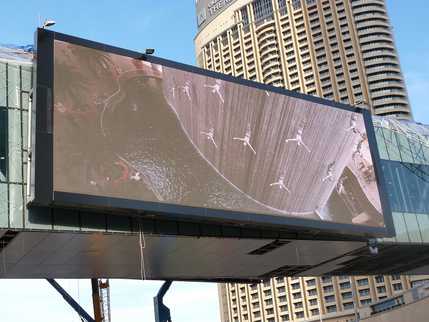 Vier Pan Beam PB 248 an einer Videowall in Dubai strahlen den Schall auch bei 50 C über 100 Meter weit. (Bild: Pan Acoustics)