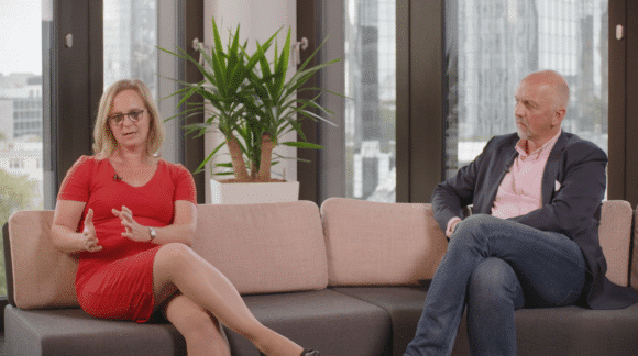 Edith Laga und Frank Boshoven sind sich bei den Herausforderungen im DigitalPakt Schule grundsätzlich einig. Beide sehen vor allem den Bedarf des Austauschs über die Schulen, Kommunen und im besten Falle auch Länder hinaus als besonders wichtig an, um die Digitalisierung in den Schulen effektiv vorantreiben zu können. (Bild: Crestron TV)