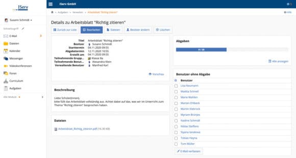 Die Lehrkräfte definieren im Modul „Unterricht“ Aufgaben für die Schüler*innen. Sie haben dabei stets den Überblick über erfüllte und nicht abgeschlossene Aufgaben. (Bild: IServ)