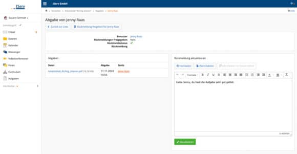 Für die Lehrkräfte ist es leicht und schnell möglich, den Schüler*innen individuelle Rückmeldungen zu gestellten bzw. korrigierten Aufgaben zu übermitteln. (Bild: IServ)