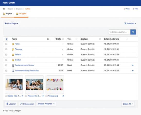Unter „Organisation“ besitzt jeder Nutzer, Schüler*in wie Lehrer*in, ein eigenes „Homeverzeichnis“ zur Ablage von persönlichen Dateien. Gruppenverzeichnisse ermöglichen das gemeinsame Erarbeiten von Dokumenten. Kalender, Stunden- und Klausurpläne wie auch Buchungen von Räumen oder Arbeitsmitteln stehen in diesem Bereich zur Verfügung. Darüber hinaus können Inhalte von Infobildschirmen strukturiert werden. In IServ ist somit eine Bildschirmverwaltung, vergleichbar mit einem Digital-Signage-CMS, enthalten.
