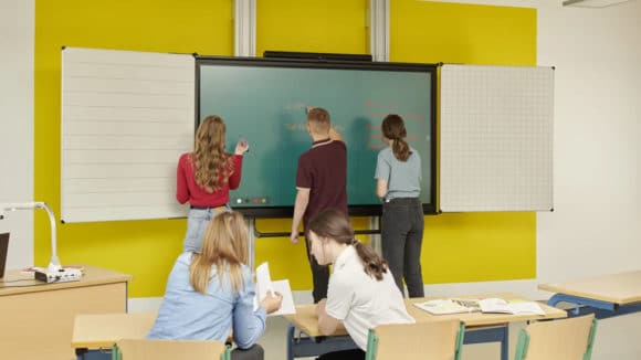 Die interaktiven 4K-Multitouch-Displays der galneoscreen Reihe werden in Monheim in verschiedenen Bildschirmdiagonalen eingesetzt und decken damit verschiedene Anforderungen ab. Mit Pylon-basierten Halterungen können sie höhenverstellbar montiert, mit analog beschreibbaren Seitenflügeln erweitert und durch umfangreiches Zubehör ergänzt werden. Mit bis zu 98″ Bildschirmdiagonale werden die Displays auch sukzessive viele der bisherigen Beamerlösungen ersetzen. (Bild: wende.interaktiv GmbH)