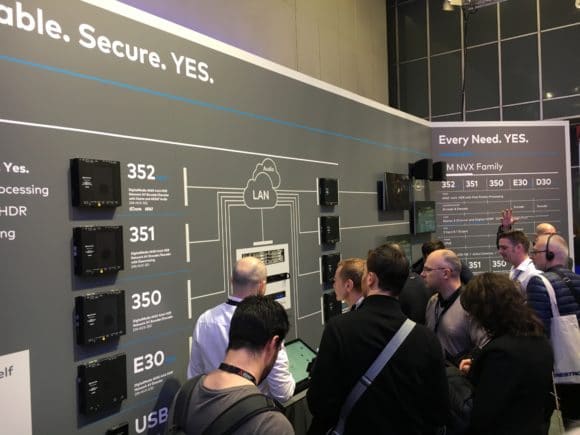 Die gesamte NVX-Serie wurde auf dem diesjährigen ISE Stand von Crestron übersichtlich dargestellt. Neben günstigeren dedizier-ten Transmittern und Receivern gibt es nun einen neuen Transceiver, der über eine Dante-Audio-Netzwerkschnittstelle verfügt und somit den Audiostream aus dem NVX-System in Dante zu Verfügung stellen oder aber Dante-Audiokanäle ins NVX-System ein-speisen kann. (Bild: Sven Schuhen)