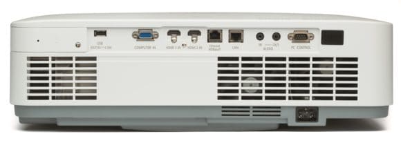 Der NEC P525UL bietet vielseitige Anschlussmöglichkeiten. Neben einem anscheinend immer noch gefragten analogen VGA-Eingang bietet der Projektor neben zwei HDMI-Anschlüssen mit HDCP-Unterstützung auch einen HDBaseT-Eingang, welcher die Ansteuerung des Gerätes mit Audio-, Video-, Steuerungs- und Netzwerksignalen über entsprechende HDBaseT-Transmitter oder ein -Matrix-System über Standard-Cat.-Verkabelung bis zu 70 m entfernt ermöglicht. Für den Anschluss von Zubehör bietet der P525UL einen USB2.0-Port vom Typ A mit 2A Stromversorgung. Das ist deutlich mehr als viele andere Geräte aufweisen und ermöglicht auch den Anschluss etwas strom-hungriger Geräte.