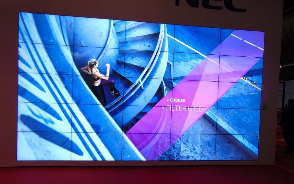 Am Standeingang bei NEC auf der ISE 2017 scheint dem Besucher schon eine farbenprächtige, leuchtstarke 5 x 5 Videowall mit MultiSync X554UNS mit 700cd/m² entgegen.