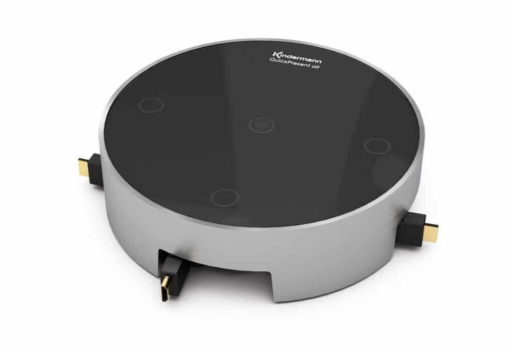 Für kleinere Besprechungsräumen oder moderne Huddle Spaces ist Kindermann QuicPresent air konzipiert. Das Tischgerät bietet drei HDMI-Anschlüsse. Im Gehäuse ist ein entsprechendes Kabel-Einzugssystem integriert. Content von einem Tablet oder Smartphone (Android oder iOS) lässt sich auch kabellos streamen. Die Bedienung bzw. Aktivschaltung der Eingangsquelle erfolgt intuitiv über berührungsempfindliche, LED-beleuchtete Sensortasten auf der Oberseite des Gehäuses. Durch den integrierten Lithium-Ionen Akku lässt sich QuickPresent air auch ohne Netzkabel für mehrstündige Meetings nutzen.
