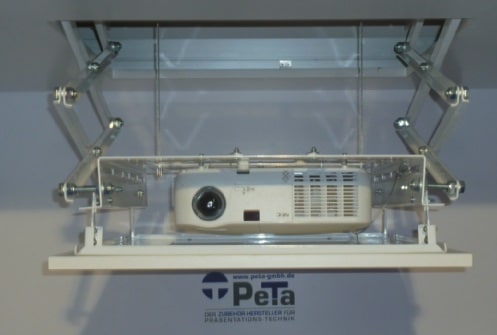Nicht zuletzt im Projektionsbereich kann PeTa seine Stärken richtig ausspielen. Das Katalogprogramm umfasst Decken- und Wandhalterungen in vielen Ausführungen, beispielsweise elektrisch per Spiegelumlenksystem oder elektrische Deckenlifte mit TÜV-Abnahme oder auf Wunsch nach BGV C1. Auch extrem flache Projektorenhalterungen oder solche mit besonders langem Hub sind machbar. Ein Beispiel für eine solche Sonderlösung ist in der Carl-Benz-Arena in Stuttgart zu sehen: Hier installierte PeTa einen elektrischen Deckenlift mit 8 Meter Hub für einen Projektor mit 130 Kilogramm, der zusätzlich eine dritte Position zur Revision haben und manuell um 90° auf eine zweite Leinwand schwenkbar sein sollte.