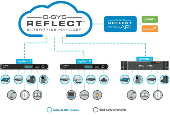 Übersichtsdiagram des QSC Reflect Enterprise Manager mit Anbindung über die API an IT-Management-Systeme wie splunk oder solarwinds. Über die Q-SYS Cores können auch Endgeräte von Drittanbietern integriert werden. (Bild: QSC)