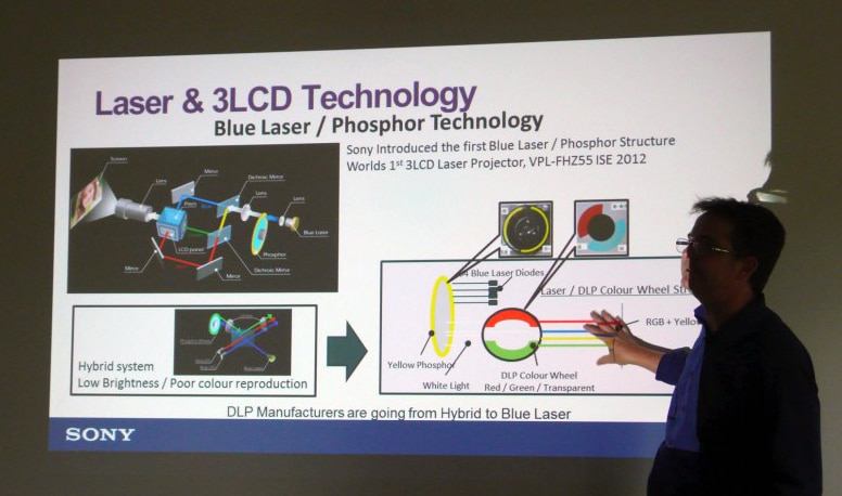Am 25.8. präsentierte Robert Meakin, Product Marketing Manager für B2B-Projektoren bei Sony Europe, im Kölner Sony-Büro die Performance und die neuen Funktionen der Projektoren. Zudem erläuterte er die Unterschiede der 3LCD-Projektoren mit Laser-Phosphor-Lichtquelle, wie Sony sie nutzt, gegenüber DLP-Modellen mit Hybrid-Lichtquelle. So seien etwa die bei der Hybridtechnik verwendeten LEDs weniger lichtstark und Streulicht anfällig. Hersteller von DLP-Projektoren wechselten daher vermehrt von der Hybrid- zur „reinen“ Lasertechnologie.