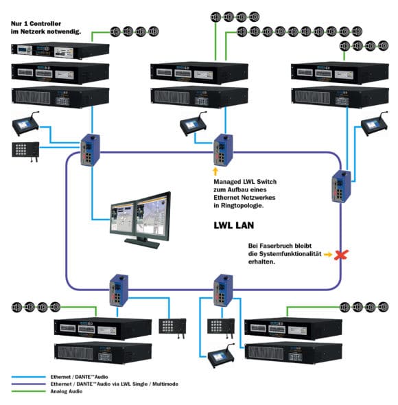 Für das Dante-Netzwerk an sich spielt es keine Rolle, ob ein Teil nach sicherheitstechnischen Gesichtspunkten ausgestattet ist oder nicht. So kann das Sprachalarmsystem mit Globalcom5400 Teil eines wesentlichen größeren Dante-Netzwerkes sein, in das sich alle Geräte mit Dante-Schnittstellen integrieren lassen. „Wir haben gerade ein Projekt gewonnen, weil es schon ein Dante-basiertes Inspizienten-System gibt“. sagt Jörg Orendi. „Durch das gemeinsame Dante-Netzwerk kann man Sprachalarmierung und Inspizienten-System so kombinieren, dass man vom Inspizienten-Pult aus in alle Räume sprechen kann, die einen Lautsprecher zur Sprachalarmierung haben. Auch bei elektroakustischen Notfallwarn-Systemen reicht ein Netzwerk für alle Bereiche und Aufgaben, ein großer Vorteil in Stadien oder Messehallen.“