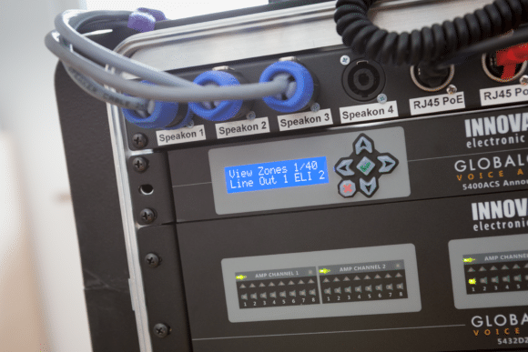 Der Controller IED 5400ACS bildet das Steuerzentrum. Zu seinen Aufgaben gehört auch das dynamische Setzen der Koppelpunkte zur Wiedergabe der gewünschten Quelle in der jeweiligen Zone. „Das ist eine der Besonderheiten des IED Globalcom5400, denn eigentlich ist der Dante-Controller nicht für ein dynamisches Setzen der Koppelpunkte konzipiert“, erläutert Jörg Orendi. „IED hat es geschafft, so auf den Dante-Controller zuzugreifen, dass jetzt z. B. beim Absetzen eines Rufes in eine Zone die Quelle aufgeschaltet und nach Beendigung des Rufes automatisch abgeschaltet wird, so dass z. B. Hintergrundmusik weiter übertragen wird.“ Die Verwaltungstätigkeiten gehören zu den Hauptaufgaben des Controllers, eine weitere ist die Überwachung. Nach einer größeren Anzahl an Audioeingängen und -ausgängen sucht man aber vergeblich auf der Rückseite des Controllers. Lediglich zwei analoge Eingänge, z. B. für nicht sicherheitsrelevante Sprechstellen oder zur Einspeisung von Hintergrundmusik, sowie zwei Ausgänge befinden sich dort. Mehr wird auch nicht gebraucht, weil alle Geräte mit Dante-Schnittstelle potenzielle Audioschnittstellen sind – etwa Mischpult-Systeme, Stageboxen, Signalprozessoren, Verstärker, Module mit analogen Ein- und Ausgängen etc. „Für die dezentrale analoge Ein- und Ausgabe von Signalen kann man auch Dante-Module zum Wandeinbau wie z. B. von Attero Tech einsetzen“, ergänzt Jörg Orendi. „Die entsprechenden Koppelpunkte werden vom ACS gleich mitverwaltet.“