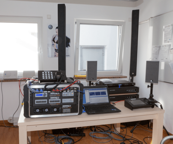 Demo-Aufbau bei MediasPro mit diversen 100 V- und niederohmigen Lautsprechern, Bittner-Endstufen und BlueBridge DSP von Atlas im Dante-Netzwerk mit den IED Globalcom5400-Geräten und einem Rechner mit Dante Virtual Soundcard zur Einspeisung von Hintergrundmusik (Bild: Christiane Bangert)
