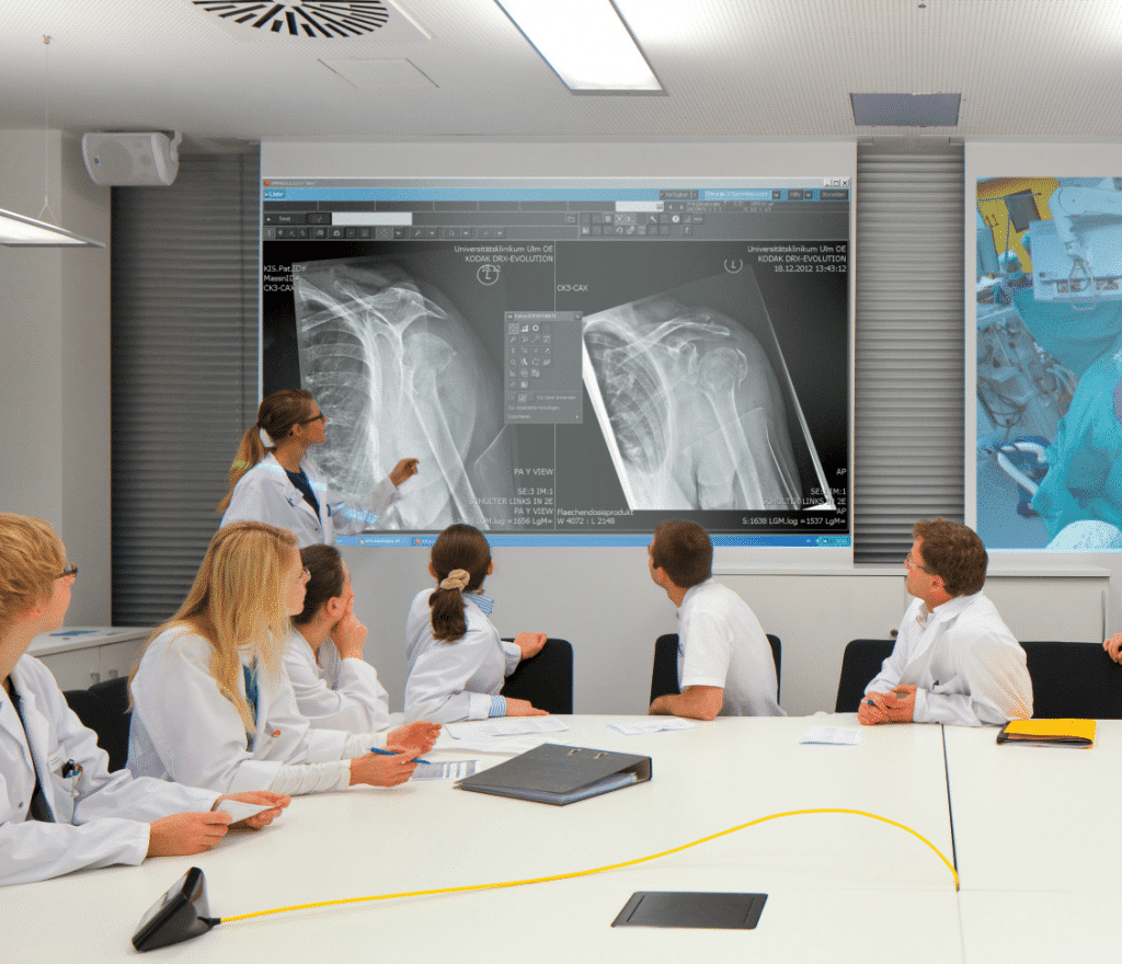 Je nach Anforderung im jeweiligen Konferenzraum sind unterschiedliche Projektoren verbaut. In sieben Räumen laufen Projektoren der „Medical“-Klasse – oft auch als DICOM-konforme Projektoren bezeichnet. Diese Projektoren haben mindestens Full-HD-Auflösung und eine besonders reich abgestufte Wiedergabe von Grautönen, sodass sie medizinisches Bildmaterial mit größtmöglicher Detailtreue wiedergeben. Die drei Projektoren vom Typ Panasonic PTDW530E, Canon Xeed WUX 10 Mk II Medical und Projectiondesign WUXGA22 Medical dürfen damit im Klinikum Ulm auch zur Befundung verwendet werden. Das heißt, die Ärzte stellen auf Basis des Projektorbilds ihre Patientendiagnose. Die restlichen Räume sind mit Epson EB 915W-Projektoren ausgestattet. Da dort keine Befundungen stattfinden, reichen hier HD-Projektoren ohne DICOM-Konformität.