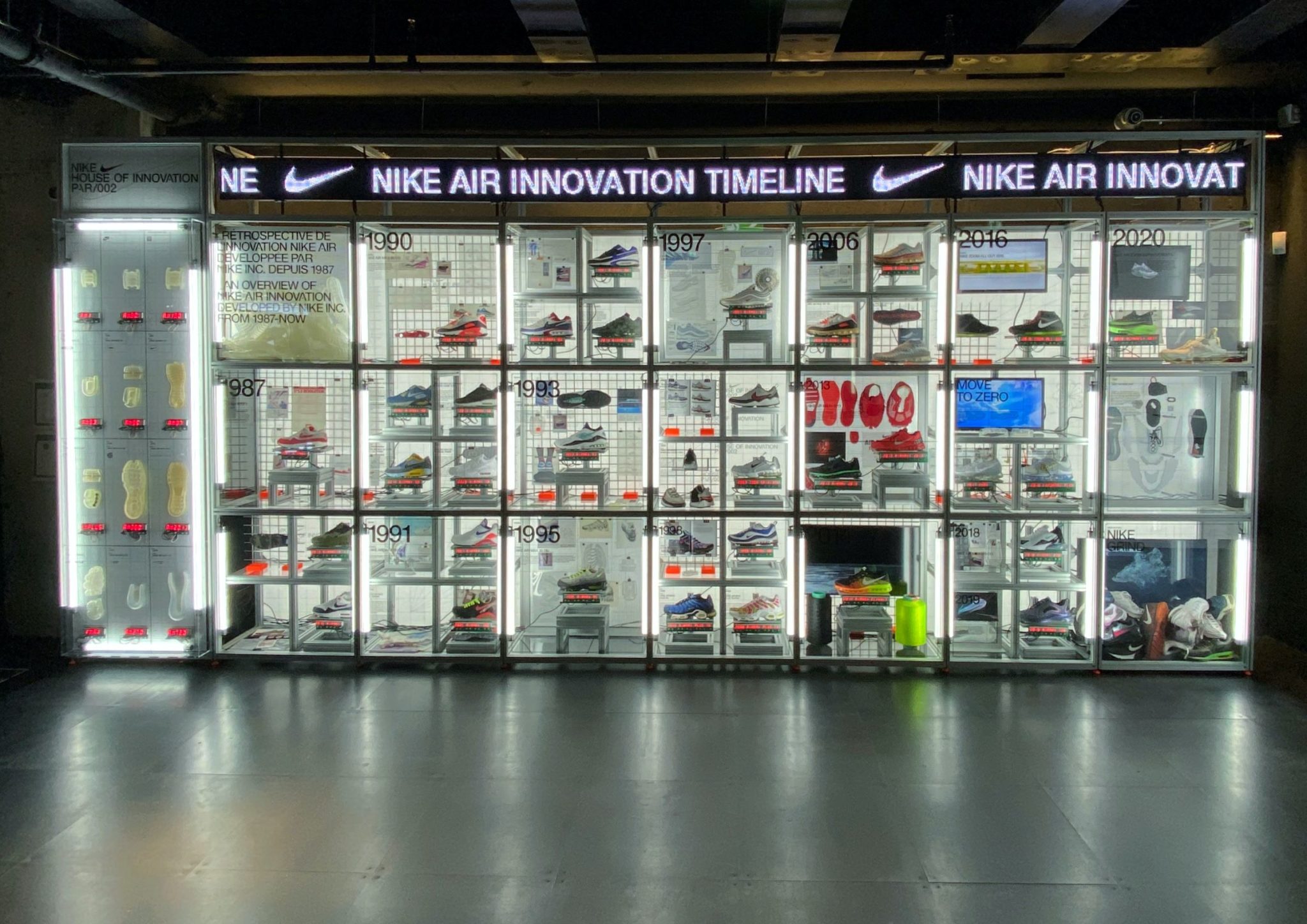 Für den Alphafly-Launch wurden darüber hinaus im Schaufenster mehrere Schaufensterpuppen auf eigens angefertigten Podesten in Stellung gebracht, gebaut aus LED-Panels und Ticker-Tape, über das die Bezeichnung des jeweiligen Schuhmodells abgespielt wurde. Für die Nike Air Innovation Timeline Wall, einer Festinstallation über die Geschichte und Innovationen von Nike Air Max im Zeitstrahl, fertigte satis&fy verschiedene, digitalisierte Schuhpodeste an und baute diverse Screens, Displays und Grafiken in das Ausstellungsdisplay.