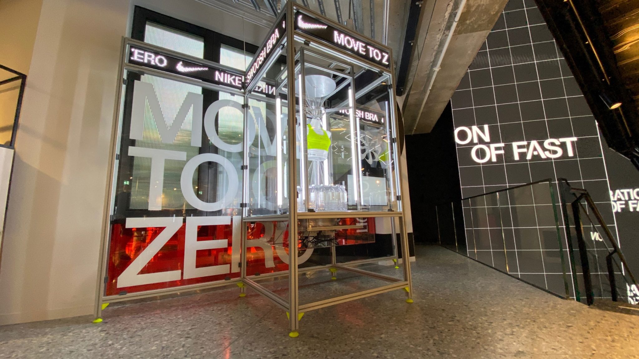 Um den Kunden immer wieder ein neues Shopping-Erlebnis zu bieten, wird vor allem die Aktionsfläche im Erdgeschoss ihr Äußeres regelmäßig ändern. Für diese steuerte satis&fy mit einem Laufparcours-Display und einer Fanzone über den Marathon-Weltrekordläufer Eluid Kipchoge zwei digitalisierte Pop-up-Installationen bei. Die Ausstellungszone zu Kipchoge, der im letzten Jahr einen Marathon unter zwei Stunden lief, widmet sich mit analogen und digitalen Lösungen seinem Erfolg, seinen Bestzeiten, seinen Entwicklungsstufen und Schuhmodellen.