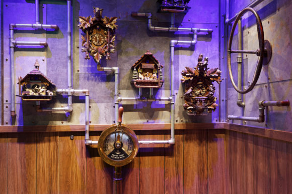 Das Time Machine Restaurant bietet viele skurrile Details wie diverse Kuckucksuhren, an den Wänden montierte Manometer oder sich im Boden drehende Zahnräder.(Bild: ASC)