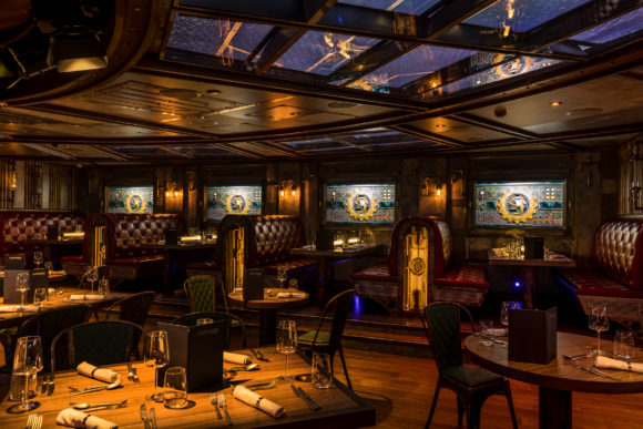 Kräftig durchgerüttelt werden die Gäste im Anschluss in eine Steampunk-Traumwelt entlassen, in der sie sich an festlich gedeckten Tischen niederlassen können – ein einzigartiges Ambiente, das in dieser Art nirgendwo sonst an Bord zu finden ist. Das Interior-Konzept wurde von AIDA Cruises in Zusammenarbeit mit der Leisure Expert Group, die auf Themenparks spezialisiert ist, mit beeindruckender Liebe zum Detail realisiert. Das dreigängige Dinner erstreckt sich über zwei Stunden, wird von professionellen Schauspielern mit „Professor Tempus“ als zentraler Figur begleitet und vermittelt den Anwesenden ein echtes Zeitreise-Feeling im Retro-Look.