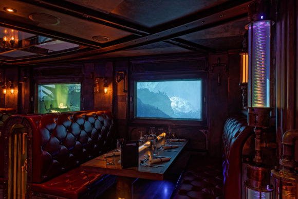 Amptown System Company (ASC) hat hier sein ganzes Know-how und Geschick in die Systemintegration von Video- und Steuerungstechnik einfließen lassen, um die fantastische Dinner Zeitreise zu einem unvergesslichen Abenteuer zu machen. Alles dreht und bewegt sich, während die Kellner ein köstliches Menü in drei Gängen servieren.