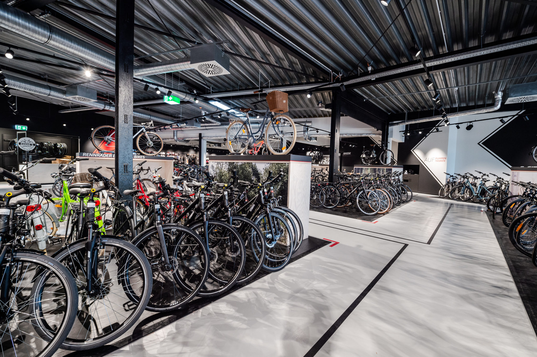 Die Architektur der Stores von fahrrad.de unterscheiden sich je nach Standort: zweigeschossig in Stuttgart, hohe Decken in Düsseldorf, schlauchförmig mit mehreren Eingängen in Berlin.