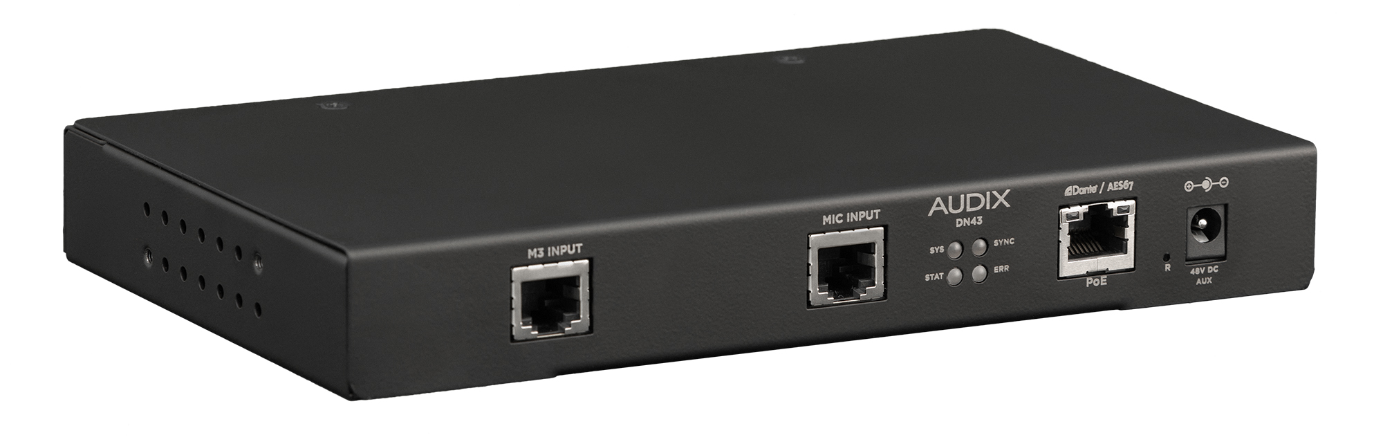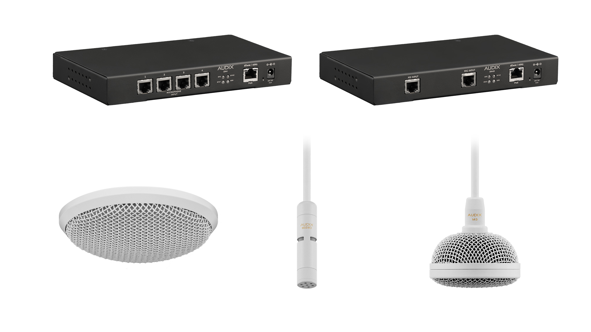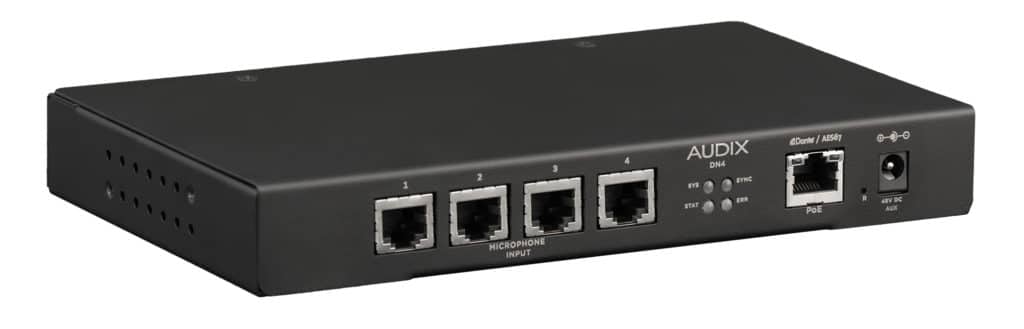 Im Herzen des Audix Dante / AES67 Integrated Microphone Systems sind die Mikrofonschnittstelleneinheiten DN4 und DN43. Der DN4 verfügt über vier Eingänge für Audix RJ45-Mikrofone mit einem Element. Der DN43 verfügt über einen Mikrofoneingang, der speziell für das Dreielement-Mikrofon Audix M3 entwickelt wurde, und einen Eingang für Einelement-Mikrofone mit Audix RJ45.