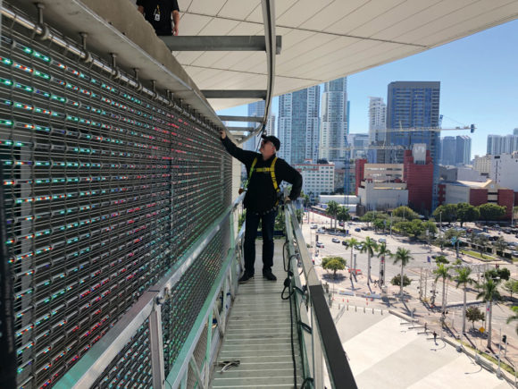 Die neue Medienfassade an der American Airlines Arena, Heimat des US-amerikanischen NBA-Teams Miami Heat, besteht aus Media- Stripes von Expromo. Diese bedecken dank ihrer Transparenz die eigentliche Fassade der Arena nur minimal und integrieren sich somit perfekt in die Architektur des Gebäudes. Zudem sind die Media-Stripes wetterfest und auf starke Windlasten geprüft, so dass die Installation auch den in Florida zum Teil auftretenden Hurricanes standhalten kann.